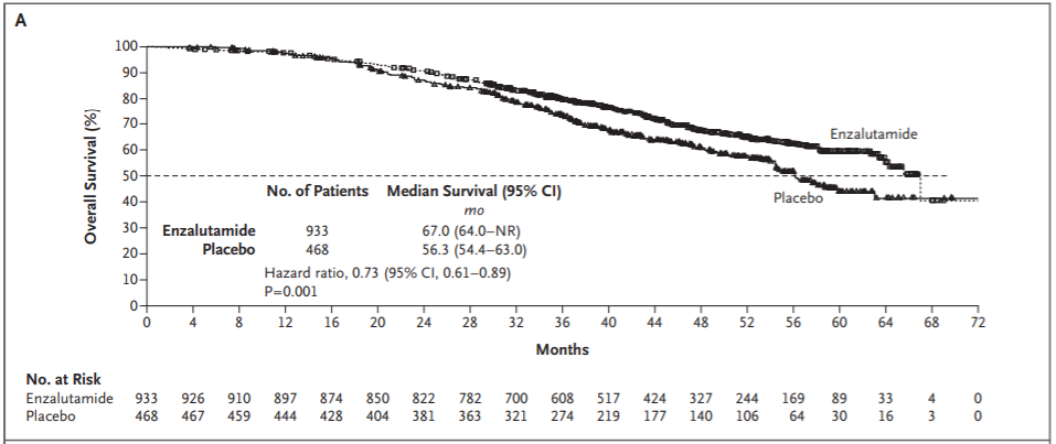2020年ASCO大会报道了PROSPER研究的第三次中期分析(中位随访67个月),并同步同步发表在NEJM杂志[5]。此次最终分析结果显示:相较于单独ADT,恩扎卢胺+ADT治疗的OS从56.3个月延长至67.0个月,死亡风险显著降低27%(67.0 vs 56.3个月,HR 0.73;P<0.001);后续治疗时间则从19.1个月延长至66.7个月(P=0.0008)。PROSPER研究中也入组了来自中国的患者,基于此,NMPA也批准了恩扎卢胺在国内的第二个适应症,用于治疗有高转移风险的非转移性去势抵抗性前列腺癌(nmCRPC)患者。
