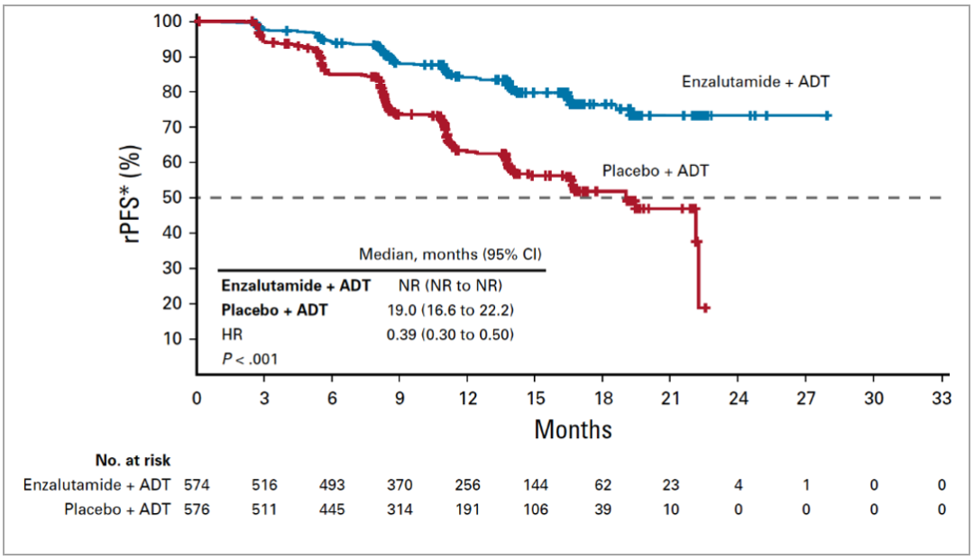 周利群教授:FDA批准的恩扎卢胺mHSPC适应症,主要是基于ARCHES研究。这是一项ADT联合恩杂卢胺对比ADT治疗mHSPC(n=1150)的随机、安慰剂对照的Ⅲ期临床试验,2019年JCO杂志发表了中位随访14.4个月的中期分析显示达到主要终点,即恩杂卢胺+ADT的rPFS有显著延长(NR vs 19.45个月,HR 0.39,P<0.001)[6]。