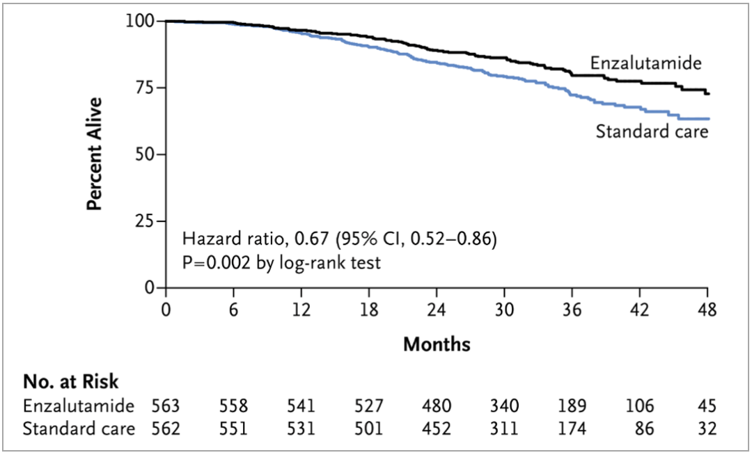 由于ARCHES研究是以rPFS为主要终点,且随访时间较短,OS尚未成熟。因此,欧盟和日本在批准恩扎卢胺mHSPC适应症时,还基于另一项同年发表在NEJM杂志的关键Ⅲ期ENZAMET研究。该研究入组1125例患者,随机接受恩扎卢胺+ADT或非甾体抗雄药+ADT。结果显示达到主要终点,恩扎卢胺+ADT组患者的3年OS率有显著提高(80% vs 72%;HR 0.67,P=0.002)[7]。