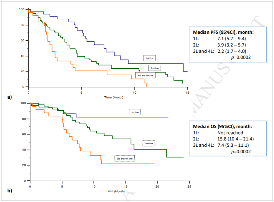 一项香港的真实世界研究分析了恩扎卢胺在不同线序mCRPC治疗中的疗效和安全性[6]。结果显示,在安全性方面,疲劳的发生率高于AFFIRM和PREVAIL试验;但越早应用,疗效更好、疲劳发生率更低。在疗效方面,总PSA应答率为43.6%,1L、2L和3L或4L治疗的PSA应答率分别为73.5%、35.1%和19.2%;PFS和OS与治疗线序显著相关(1L、2L、3/4L治疗的PFS:7.1、3.9、2.2个月;OS:未达到、15.8、7.4个月;P=0.0002),即越早用,患者获益越好[8]。