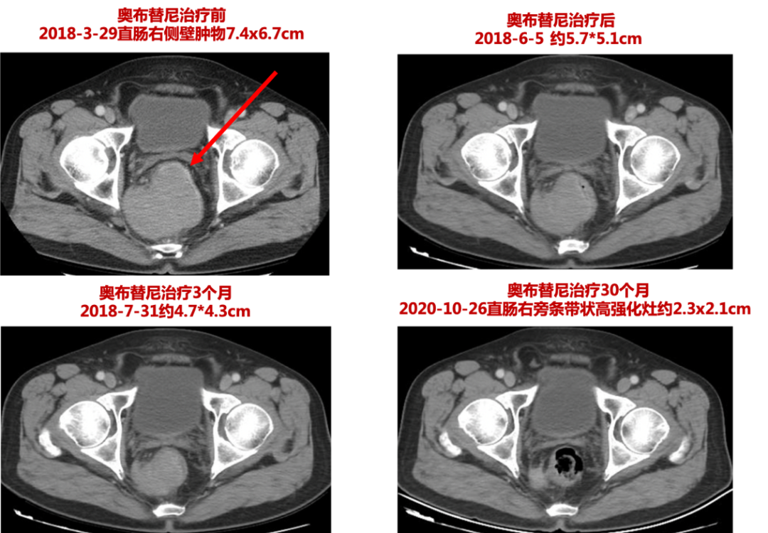 图1.奥布替尼临床应用病例分享——直肠病灶CT变化