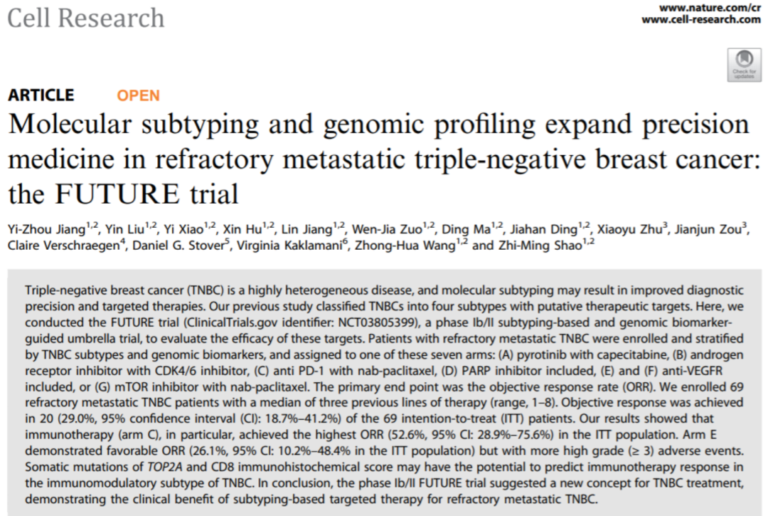 TNBC是一组异质性疾病,根据中国人TNBC的数据,2019 年,复旦大学附属肿瘤医院团队“绘制”出全球最大的TNBC多组学图谱并提出了“复旦分型”(Cancer Cell, 2019),为TNBC治疗靶点的探寻提供了理论基础。此后,FUTURE的 “伞形”临床研究初步提示,应用复旦分型的精准分类,为患者选用合适的治疗方案可以显著提高难治性TNBC的疗效(Cell Research, 2020)。2020年复旦团队绘制出国内首个,最大规模的单中心中国人群乳腺癌基因突变图谱并在2020年11月10日《Nature Communications 》发表。该图谱有效填补了国人乳腺癌基因图谱的“空白”,为全面探索中国人群乳腺癌精准治疗靶点及治疗提供了良好基础。