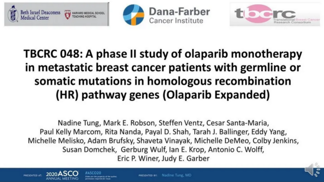 2020年的ASCO会议上公布了TBCRC048研究(奥拉帕利扩展试验),该研究进一步探索了PARP抑制剂奥拉帕利单药治疗同源重组通路基因胚系或体系突变的转移性乳腺癌的疗效。结果证实,奥拉帕利不仅可以在gBRCA1/2突变患者具有良好的疗效,而且在胚系PALB2、体系BRCA1/2突变患者中也具有很好的疗效,但需大样本的临床研究来进一步验证。