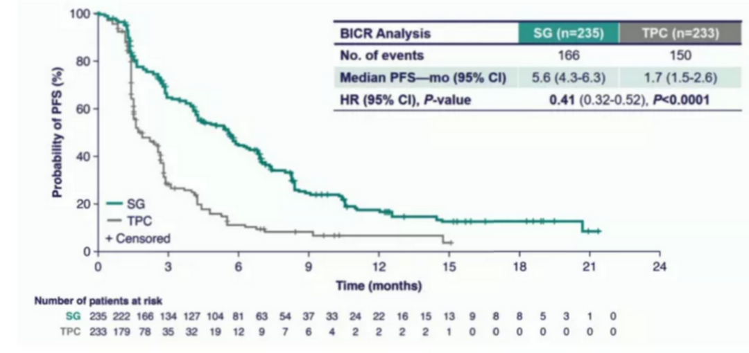 新型抗体药物偶联物(ADC)在治疗经治mTNBC中也有相应的探索,sacituzumab govitecan(SG)是一种新型的ADC药物,由抗人滋养层细胞表面抗原2(Trop-2)抗体通过独特可水解连接物与伊立替康的活性代谢产物SN-38偶联组成。SG是首个获批的靶向Trop-2的新型ADC药物,也是FDA依据IMMU-132-01研究在2020年4月加速批准的首个治疗用于三线及以上mTNBC的ADC药物。2020年ESMO首次公布了进一步验证SG在mTNBC临床获益的III期ASCENT研究,结果显示,在先前接受过治疗的mTNBC中,与化疗相比,SG单药显著延长了PFS(5.6月vs 1.7月,HR=0.41,95%CI:0.32-0.52,p<0.0001)。ASCENT研究成功验证了SG对mTNBC的显著疗效,确立了其作为既往接受过治疗的mTNBC的标准治疗地位,为mTNBC提供了新的治疗选择和希望。