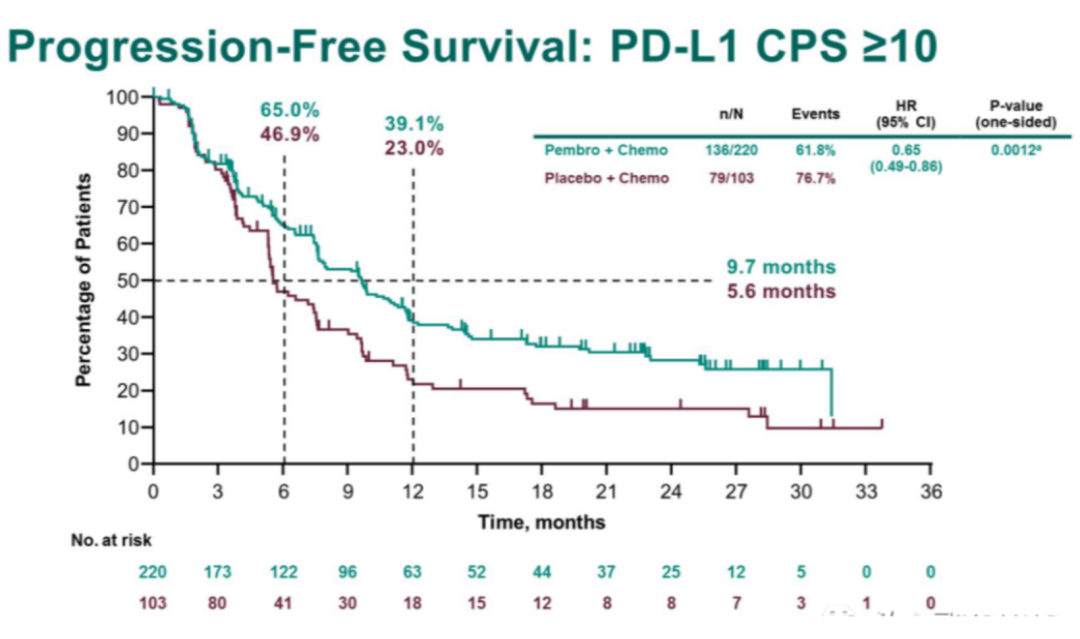 KEYNOTE-355研究是一项评估PD-1抑制剂帕博利珠单抗(pembrolizumabs)+化疗一线治疗局晚或mTNBC随机、双盲的Ⅲ期研究。2020年ASCO大会报道的结果显示,在CPS≥10的患者中,pembrolizumabs+化疗获得PFS的显著改善(9.7 vs 5.6个月)。2020年度ESMO Asia大会进一步报道亚洲人群的数据,中位随访25.7个月,在ITT人群中,pembrolizumabs+化疗改善PFS(8.8 vs 6.7个月),且随着PD-L1表达水平的增加,治疗效果也提高。