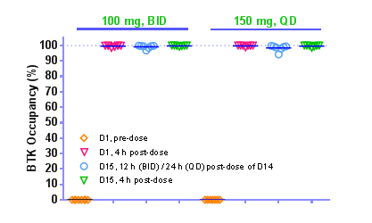 刘澎教授:伊布替尼是全球首个上市的BTK抑制剂,目前伊布替尼的获批剂量为420mg 每日一次(QD)和560mg 每日一次(QD),研究表明伊布替尼420mg QD剂量下,外周血单核细胞BTK占有率的中位水平为96-99%【1】,患者个体间差异较大,部分患者BTK靶点占有率在80%以下,在给药后4~24h内BTK靶点抑制降低。560mg QD剂量下,患者在用药后4小时内BTK占有率可达到95%【2】,用药24小时,部分患者BTK占有率在80%左右。