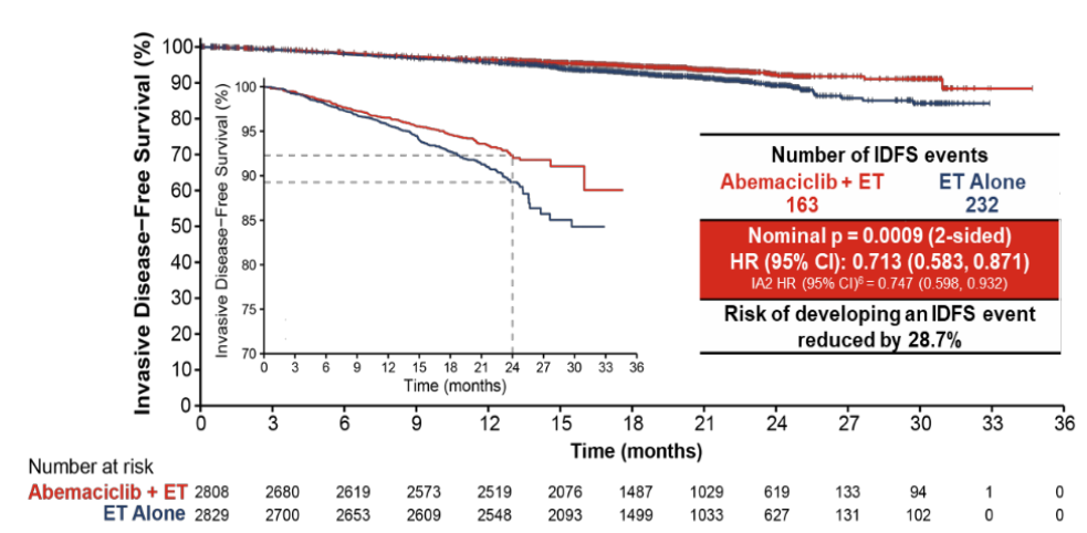 monarchE研究是一项多中心、随机对照的Ⅲ期临床研究,共纳入5637例患者,按1:1接受阿贝西利(150mg, bid,治疗2年)+内分泌治疗或单纯内分泌治疗。主要研究终点是无侵袭性疾病生存(iDFS)。次要研究终点为无远处复发生存(DRFS)、总生存和安全性等。研究结果表明2年的iDFS率在阿贝西利联合ET组为92.3%,单用ET组为89.3%。有3%的差异,可降低30.9%的复发风险。安全性方面,阿贝西利最常见的不良事件是中性粒细胞减少(18.5%)、白细胞减少(10.8%)和腹泻(7.7%)。此外,阿贝西利联合治疗在Ki-67高表达人群获益更大,可降低30.9%的复发风险,2年绝对获益为4.5%(阿贝西利组为91.6%,对照组为87.1%)。