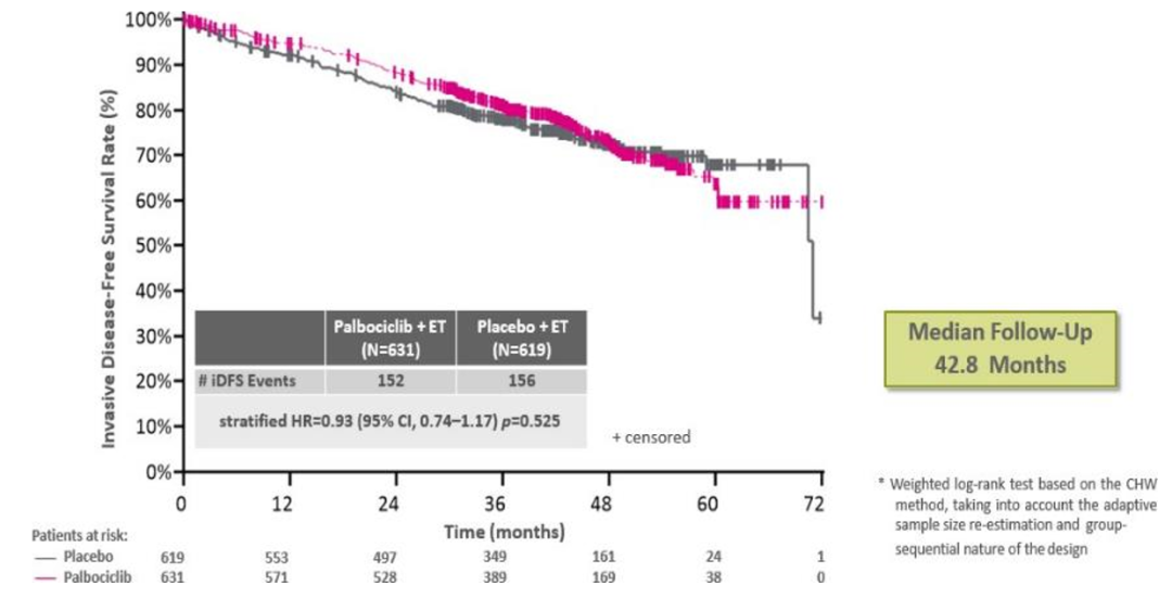 这是一项随机,双盲,安慰剂对照的Ⅲ期研究。入组人群为:完成NACT后行根治性手术,术后non-pCR,且NACT后残留乳腺病灶或芯针活检乳腺或残留阳性淋巴结经确认为 HR+/HER2-;CPS-EG评分≥3或2且ypN+;新辅助化疗≥16周(包括紫杉类药物6周)。一共入组1250例患者,随机1:1分配到Palbociclib+ET组或placebo+ET组,主要研究终点为iDFS。中位随访42.8个月,两组人群iDFS事件数分别为152(Palbociclib+ET)和156(placebo+ET),无统计学差异(HR=0.93;95%CI:0.74~1.17;P=0.525)。并且这一结论在不同淋巴结状态、年龄、Ki-67、CPS-EG评分或人种分层研究中,均保持一致。OS事件数两组人群分别为62(Palbociclib+ET)和69(placebo+ET),无统计学差异(HR=0.87;95%CI:0.61~1.22;P=0.420)。并且从安全性和患者依从性上,Palbociclib+ET因更多的血液学相关不良事件发生,导致更多的患者不得不接受药物减量或中断治疗。