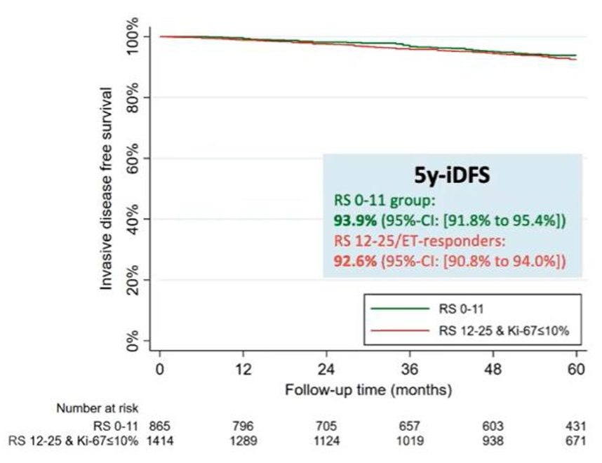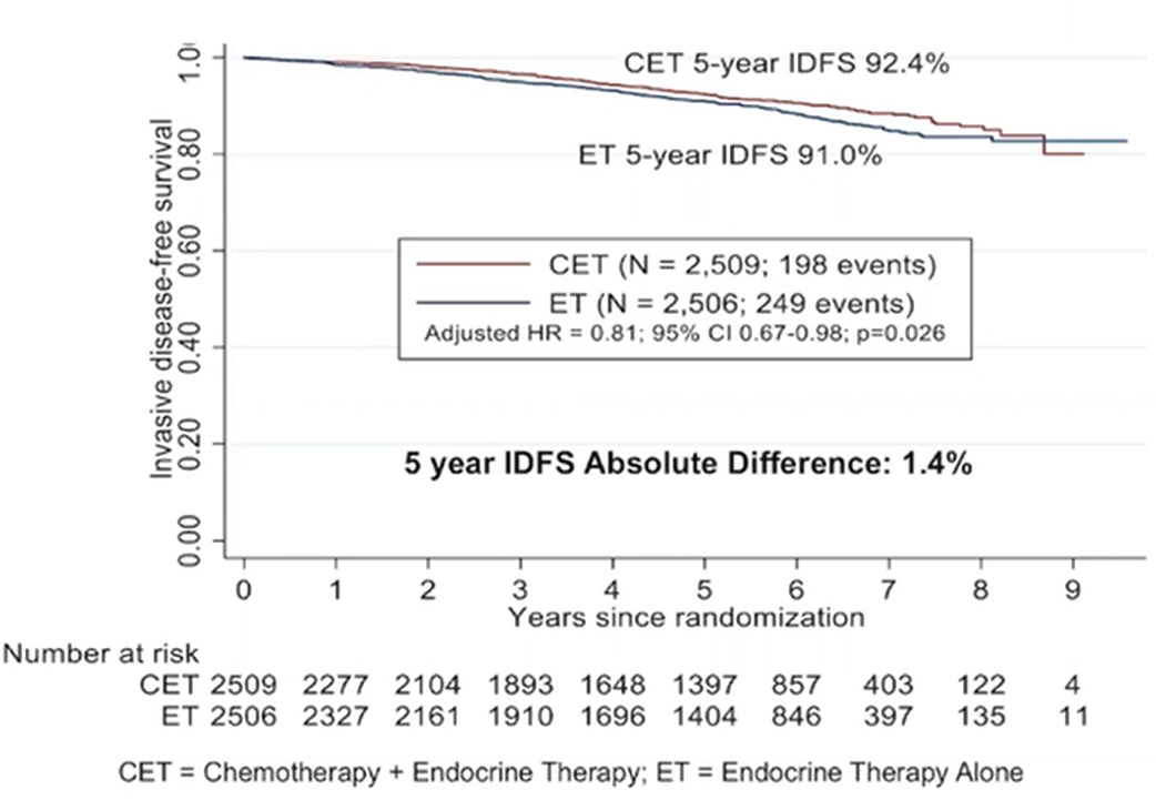 该研究纳入了LN1-3枚阳性、RS≤25的HR+/HER2-乳腺癌患者,随机化后分为化疗序贯内分泌治疗(CET)和单纯内分泌治疗组(ET)。50%患者接受4周期或6周期TC方案,其余接受以蒽环为基础的化疗方案。主要研究终点是iDFS。在中位随访5.1年后,总体人群中,患者5年iDFS:CET(92.4%)vs ET(91.0%),(HR=0.81,95%CI:0.67~0.98,P=0.026),RS 0~25分是一项预后指标但是与化疗并未显示治疗交互作用。亚组分析中显示,绝经前患者iDFS可从化疗中显著获益降低了46%的iDFS事件,绝对获益5.2%(CET 94.2% vs ET 89.0%, HR=0.54,95%CI:0.38~0.76,P=0.0004)。而绝经后患者,不能从化疗中获益(CET 91.6% vs ET 91.9%,HR=0.97,95%CI:0.78~1.22,P=0.82)。