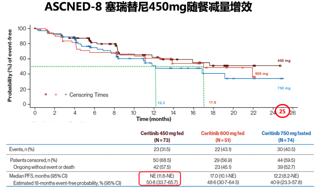 首先,ASCEND-8研究表明了塞瑞替尼从750mg空腹调整至450mg随餐剂量后,达到了减量减毒但不减效的目的,尤其是3/4级不良反应下降非常明显。减量后患者依从性增加,因不良反应导致治疗中断、减量或停药的情况明显减少,患者治疗连续性增加,疗效因而得到提升,450mg组中位PFS超25个月仍未到达。