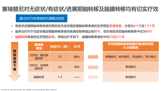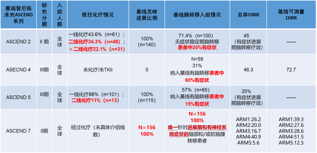 ASCEND系列的多个研究都允许有症状、进展期脑转移患者入组,如ASCEND-2研究入组患者中71.4%为脑转移,其中20%为有症状、进展期脑转移患者,总体颅内ORR达到45%。ASCEND-4研究纳入31%的脑转移患者,其中高达60%为有症状、进展期脑转移,总体颅内ORR达到46.3%。ASCEND-5研究纳入57%的脑转移患者,其中15%为有症状、进展期脑转移,在有症状、进展期的脑转移患者中,总体颅内ORR达35%。ASCEND-7研究更是唯一前瞻性纳入进展期、有症状ALK阳性脑转移及脑膜转移的临床研究,提供了非常宝贵的数据。