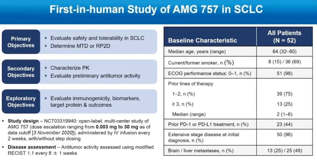这项多中心、非盲I期研究纳入52例小细胞肺癌患者,评估AMG757在接受≥1线铂类化疗后复发/难治性SCLC患者中的安全性和疗效。患者静脉注射AMG 757(9个剂量水平;剂量范围:0.003-30 mg q2w,±阶梯式给药)。主要终点是安全性和耐受性,以及确定最大耐受剂量或II期推荐剂量。截至2020年11月3日,共纳入52例患者(中位年龄为64岁;中位治疗线数为2),大多数(98%)患者ECOG PS评分为0或1。44%患者先前接受过PD-1/PD-L1抑制剂治疗。此外,96%的患者在最初诊断时为广泛期SCLC,25%有脑转移,48%有肝转移。