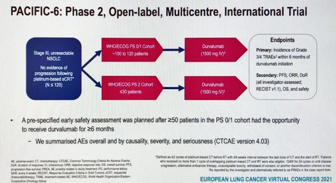 2021 ELCC报道了不可切除III期非小细胞肺癌患者序贯放化疗后使用度伐利尤单抗的早期安全性评估(PACIFIC-6),为不能耐受同步放化疗的人群做了进一步探索性分析。值得注意的是,PACIFIC-6研究中度伐利尤单抗巩固治疗方案调整为每4周一个周期,治疗时间≤24个月或直到疾病进展、不可耐受的毒性停药。主要终点是安全性/耐受性评估,定义为6个月内发生的3/4级治疗相关不良反应(TRAEs),在接受度伐利尤单抗治疗≥6个月的PS 0/1队列(预期为100-120例)中进行早期评估。PACIFIC-6结果表明,序贯放化疗后使用度伐利尤单抗与同步放化疗后使用度伐利尤单抗,两种方案的安全性相似。