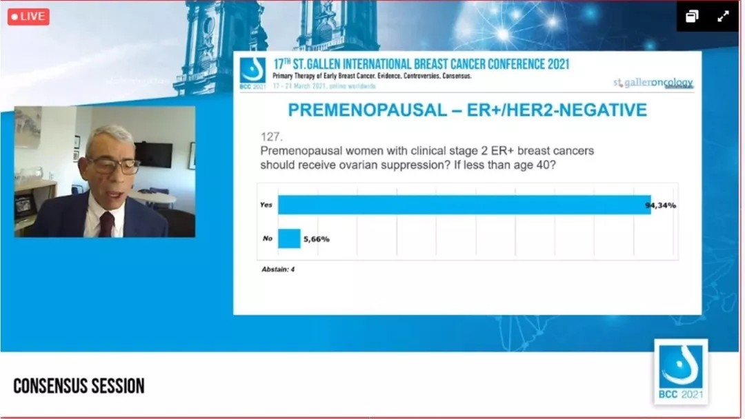 年龄<40岁、临床分期为2期的ER+绝经前乳腺癌患者,应该接受卵巢抑制吗?94.34%的专家选择“是”,5.66%的专家选择“否”,4人弃权。