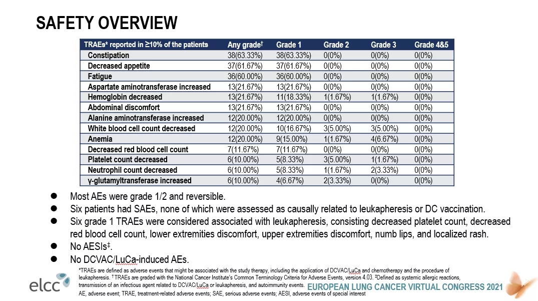 研究发现,DCVAC/LuCa联合化疗的安全性良好,最常见的治疗相关不良反应包括便秘63%、食欲下降62%、乏力60%、谷草转氨酶(AST)升高22%、血红蛋白减低22%、腹部不适22%等,大部分为1/2级且可缓解。无DCVAC-LuCa相关不良反应。
