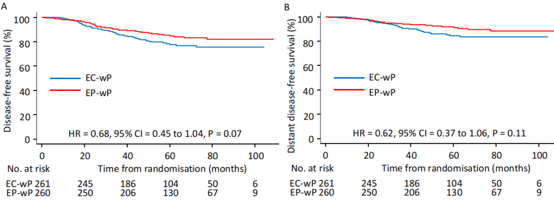 中位随访62个月结果显示,EC-wP与EP-wP相比:1年月经恢复率:48.3% vs. 63.1%(95%CI:42.2%~54.3%、57.2%~68.9%;绝对差异:14.8%,95%CI:6.37%~23.2%,P<0.001);5年无病生存率:78.3% vs. 84.7%(95%CI:72.2%~83.3%、79.3%~88.8%,分层对数秩P=0.07)。4年成功妊娠率:2.7% vs. 9.6%(P=0.03)。