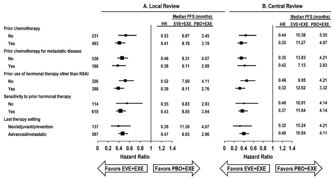 王树森教授:BOLERO-2入组患者均为AI耐药,包括原发(新辅助或辅助治疗12个月内复发)和继发耐药,从亚组分析来看,无论原发(6.83 vs 2.83个月,HR 0.55)还是继发耐药(8.05 vs 3.94个月,HR 0.43)PFS均有改善。因此,依维莫司是可以作为逆转内分泌耐药的选择。当然,BOLERO-2、BOLERO-4研究提示依维莫司作为一线治疗选择也有获益,但是可以更专注于内分泌治疗耐药的人群。