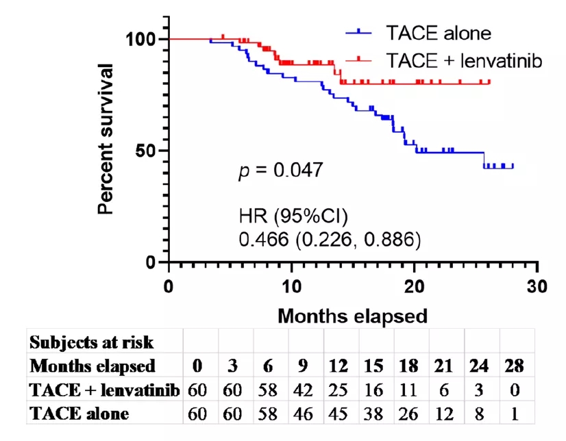TACE+仑伐替尼组中位随访时间为17.5个月,单独TACE组则为11.6个月,研究数据显示,TACE+仑伐替尼组的1年和2年OS率分别为88.4%和79.8%,单独TACE组则为79.2%和49.2%,HR=0.466(95%CI: 0.226~0.886, P=0.047),TACE+仑伐替尼治疗显著延长了患者中位OS(见图1)。