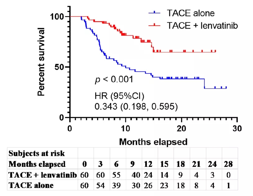 无进展生存率方面,TACE+仑伐替尼组的1年和2年PFS率分别为78.4%和45.5%,单独TACE组则为64.7%和38.0%,HR=0.343(95%CI: 0.198~0.595),联合治疗同样显著延长了患者PFS(见图2),亚组分析显示在巴塞罗那肝癌分期(BCLC)为B期或C期的患者中,TACE+仑伐替尼治疗的获益趋势与患者整体人群基本一致。