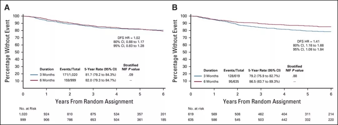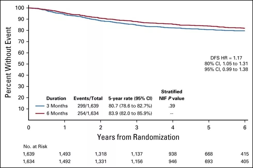 分析共包括3273例高危Ⅱ期肠癌患者。根据医生或患者的选择,这些患者接受了FOLFOX方案(38%的患者)或CAPOX(62%的患者),并随机分配进行3个月或6个月的治疗。主要终点为无病生存期(DFS),如果分层Cox模型估计的DFS风险比(HR)( 3个月 vs. 6个月)的双侧80%CI低于1.2,则结果满足非劣效性(NI)。为达80%的效力,共需要542例DFS事件来判定NI。