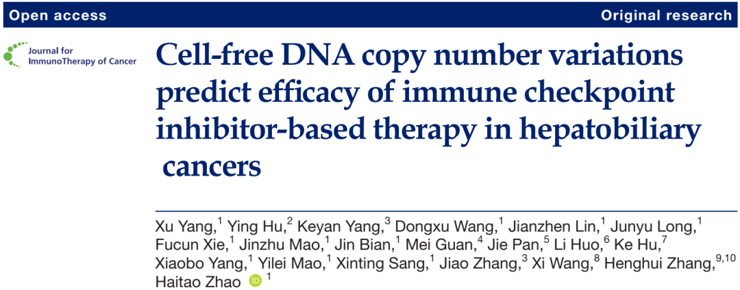 肝胆恶性肿瘤(含肝细胞癌、胆管细胞癌及胆囊癌)既往治疗难度大、患者预后差,PD-1/L1抑制剂等免疫检查点抑制剂被寄予厚望,尤以IMbrave150为代表的免疫联合方案为患者带来了显著的生存获益。但在目前临床实践中尚缺乏预测疗效的手段。近期,北京协和医院赵海涛教授团队发表最新研究,指出检测细胞游离DNA(cfDNA)的肿瘤相关拷贝数变异(CNVs)水平,或可预测免疫治疗效果,研究论文于Journal for ImmunoTherapy of Cancer(IF=10.25)发表,现整理如下。