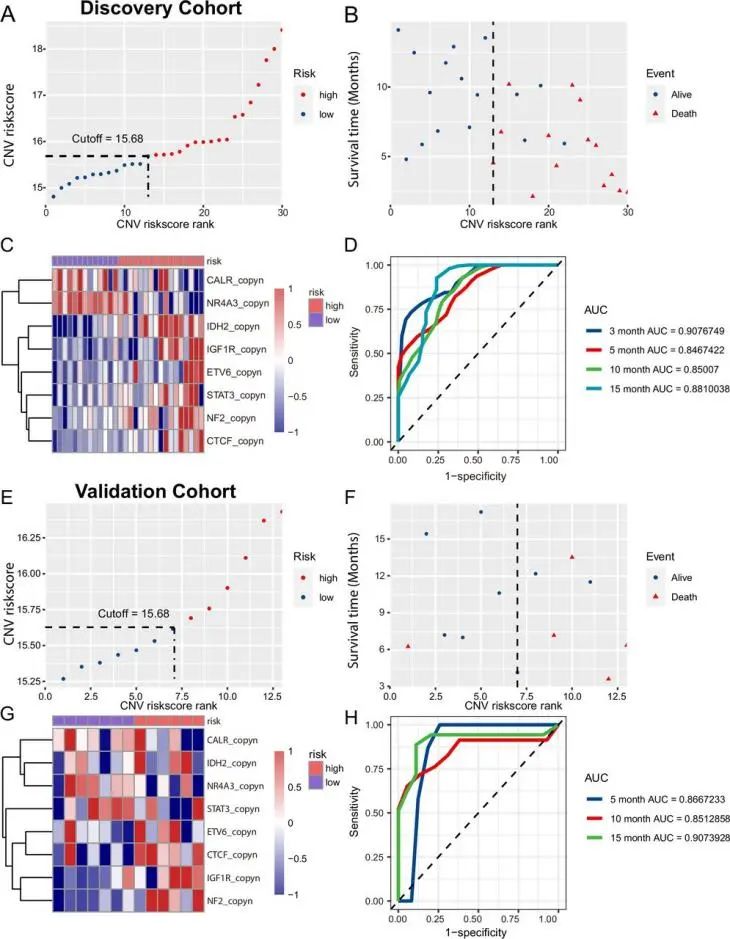 基于探索集30例患者血浆cfDNA中CNVs水平,研究团队通过LASSO降维的方式选取8个基因(CALR、NR4A3、IDH2、IGF1R、ETV6、STAT3、NF2和CTCF)建立基于CNVs的风险评分,以风险评分15.68作为免疫联合治疗后低风险与高风险的Cut-off值,验证集13例患者中,高于该Cut-off值患者的中位OS为10.37个月,低于该值患者的中位OS尚未达到(P=0.11),风险评分在不同时间点对建模队列患者生存时间预测的曲线下面积(AUC)为0.847~0.908(见图2);全部43例患者(探索集+验证集)中,CNV风险评分低患者的中位PFS为6.17个月,中位OS未达到,均显著优于风险评分高的患者(中位PFS为2.60个月,中位OS为6.5个月)。
