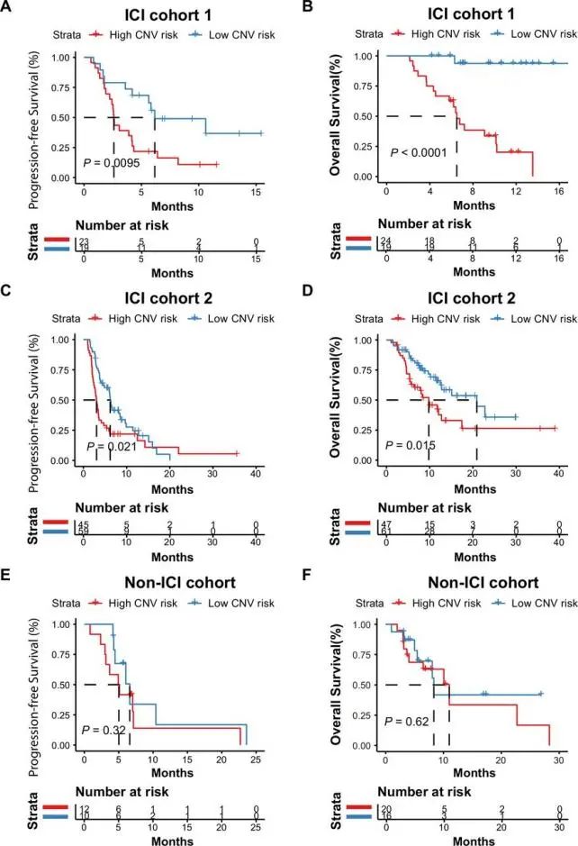 图3.CNV风险评分在不同队列中与患者PFS和OS的相关性