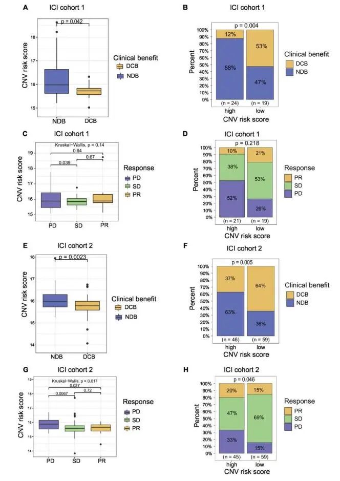 对患者治疗后应答情况进行的分析显示,在建模队列1中CNV风险评分低的患者,有53%可达到持久临床获益,显著高于风险评分高患者的12%(P=0.004),CNV风险评分低患者的疾病控制率(DCR,即PR+SD)为74%,高于风险评分高患者的48%(P=0.093);验证队列2中存在相似的应答状况差异,风险评分低患者有64%可达到DCB,显著高于风险评分高患者的37%(P=0.005),两组DCR分别为85%和63%(P=0.011),详细风险评分与患者疗效应答的情况见图4。