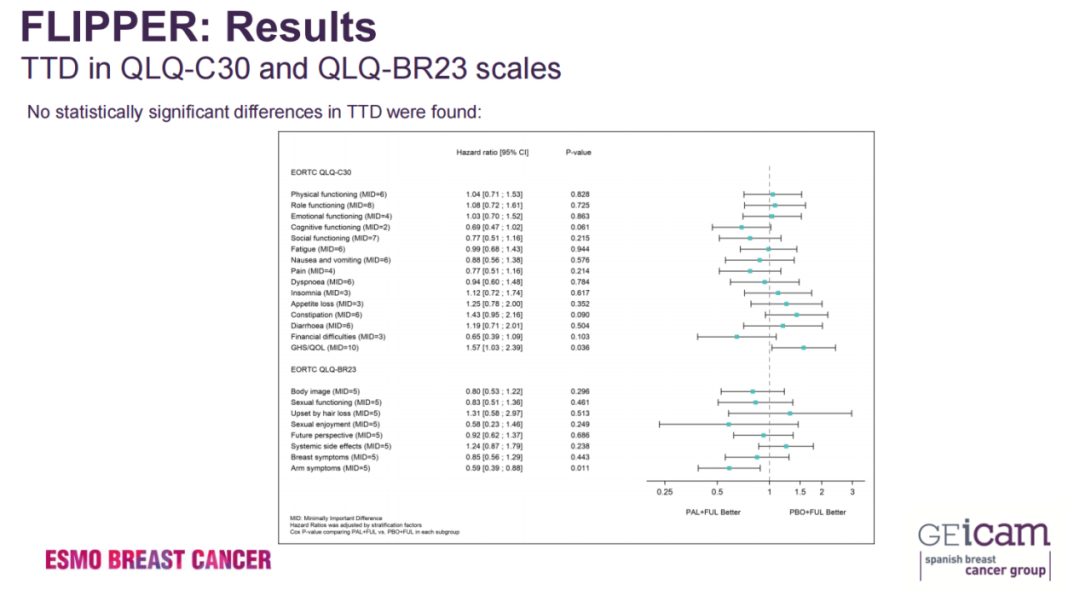 在前22个周期中,问卷调查的完成率很高(>95%)。各组间基线水平GHS/QoL的总体变化有显著性差异,食欲减退,便秘和全身治疗副作用评分有利于FUL/PBO组。在其余功能和症状量表上,两组间没有发现其他统计学上的显著差异。FUL / PBO组相较于FUL /PAL组的GHS/QoL中位TTD有所延迟[30.3个月vs. 11.1个月,校正后的HR(aHR)=1.57,95%CI:1.03~2.39,P=0.036];在PBO治疗无进展性疾病(PD)的患者中,GHS/QoL TTD有所延迟(aHR=2.0,95%CI:1.1~3.8,P=0.023),但在PD患者中没有影响(aHR=1.2,95%CI:0.6~2.2,P=0.658)。对于QLQ-C30和QLQ-BR23量表,TTD在统计学上没有显著差异。