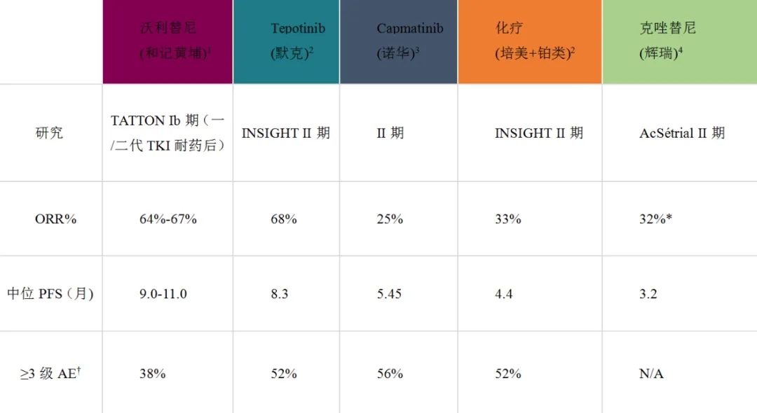 不良反应方面,四种药物的相似点是都有外周水肿、消化道反应、转氨酶升高等。不一样的地方是,沃利替尼没有间质性肺炎的报道,而Capmatinib和Tepotinib都有间质性肺炎的发生。