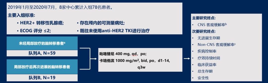 方法:为了探讨吡咯替尼在HER2阳性乳腺癌脑转移患者中的疗效和安全性,这项单臂、前瞻、开放标签的多中心Ⅱ期试验,入组患者为HER2阳性转移性乳腺癌,存在颅内的可测量病灶,ECOG 评分≤2,既往未使用抗HER2 TKI治疗。其中队列A为未经局部放疗的脑转移患者,队列B为局部放疗后再次进展的脑转移患者。患者接受吡咯替尼(400 mg,qd,po)联合卡培他滨(1000mg/m2, bid,po,d1-14,q3w)治疗。研究的主要终点为CNS客观缓解率(CNS ORR);次要终点包括无进展生存期(PFS)、Non-CNS ORR、疾病控制率(DCR)、疗效持续时间(DoR)、临床获益率(CBR)、总生存期(OS)和安全性。