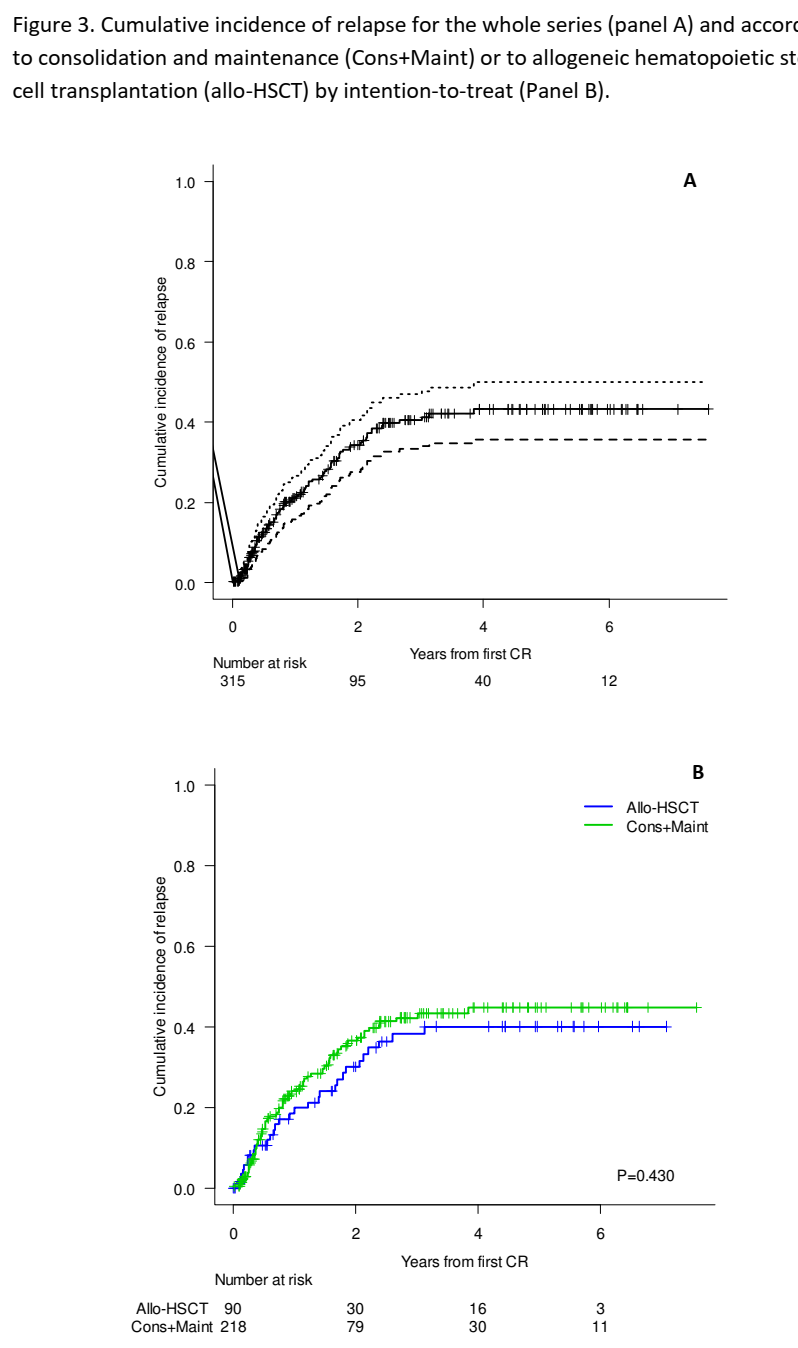 图3 累积复发率:A 全部患者,B并根据巩固和维持治疗后与allo-HSCT后的比较
