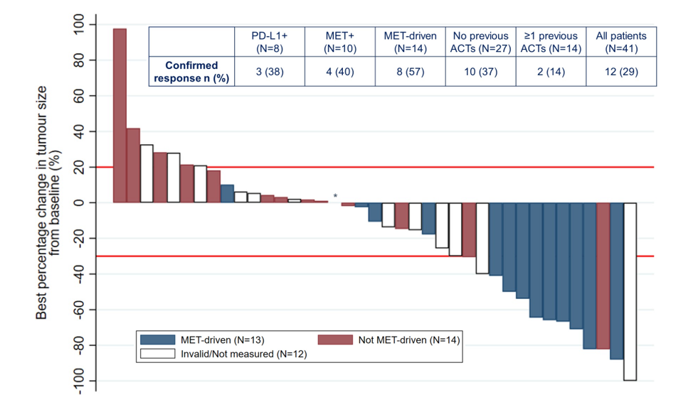 CALYPSO研究是一项1/2期研究,入组了41例pRCC患者,旨在探讨Savolitinib联合度伐利尤单抗的疗效和安全性。去年ASCO-GU大会报道的数据显示该疗法具有一定的治疗活性,ORR为29%,mPFS和mOS分别为4.9(95%CI 2.5~12.0)个月和12.3(95%CI 5.8~21.3)个月。该研究中有14例患者为MET驱动基因阳性pRCC,此次ASCO大会进一步报道此队列人群的数据(摘要号:4511)。