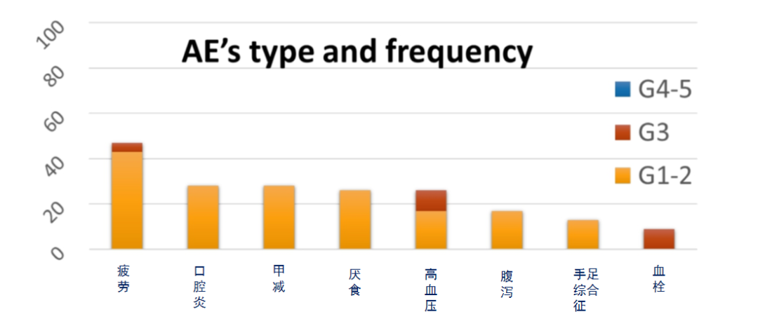 所有患者均报告至少1-2级不良事件,但总体耐受性良好,常见的不良事件为疲劳(43%)、甲减(28%)、口腔炎(28%)、厌食(26%)、手足综合征(13%)、高血压(17%)和腹泻(13%)。