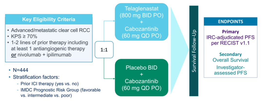背景:代谢失调是肾细胞癌的一个特征,由谷氨酰胺代谢的关键酶谷氨酰胺酶(GLS)的过度表达所驱动。Telaglenastat(Tela)是一种研究性的、全球首创新药(first-in-class)、选择性的口服GLS抑制剂,可阻断谷氨酰胺利用和关键下游途径。临床前研究提示,Tela可与VEGFR2/MET/AXL抑制剂卡博替尼(Cabo)协同作用,抑制RCC肿瘤。在1期研究队列中,Tela+Cabo作为2L+治疗mRCC的安全性/有效性令人鼓舞。本试验比较了Tela+Cabo和Pbo+Cabo在经治疗肾透明细胞癌患者中的作用。