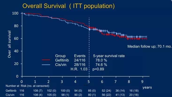 在中位随访70.1个月时,116例接受吉非替尼治疗的患者的5年OS率为78.0%,116例接受顺铂/长春瑞滨治疗的患者的5年OS率为74.6% (HR=1.03; 95% CI: 0.65-1.65; P=0.89),总体生存率无显著差异;