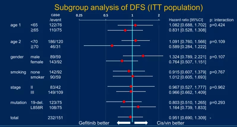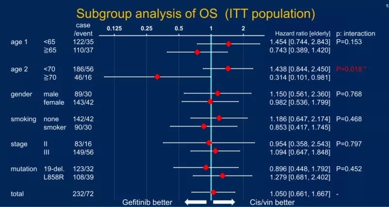 DFS的探索性亚组分析结果显示,老年患者(年龄≥70岁)中两组的数据显示出差异,其HR为0.589,结果有利于吉非替尼组(95% CI: 0.284-1.222)。同样,在OS的探索性分析中,年龄≥70岁患者使用吉非替尼的生存率更高(HR=0.314; 95% CI: 0.101-0.981)。