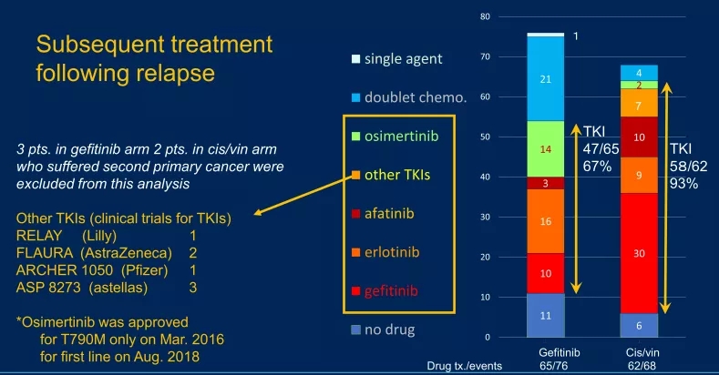 复发后的后续治疗:在76例吉非替尼治疗后复发的患者中,67%继续使用酪氨酸激酶抑制剂(TKI)治疗,包括14例继续接受奥希替尼。在顺铂/长春瑞滨组中,93%的复发患者继续接受TKI治疗;7例患者被纳入临床试验,包括1例患者参加RELAY试验(NCT02411448),2例患者参加FLAURA试验(NCT02296125)。