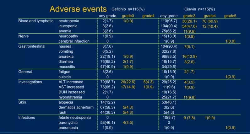 顺铂/长春瑞滨没有3/4级皮肤相关事件,而吉非替尼组有4.3%患者出现3级痤疮性皮炎,4.3%出现3级皮疹。接受吉非替尼治疗的患者中,超过一半出现任何级别的痤疮性皮炎(58.3%),接受顺铂/长春瑞滨治疗的患者中46.1%出现任何级别的脱发。