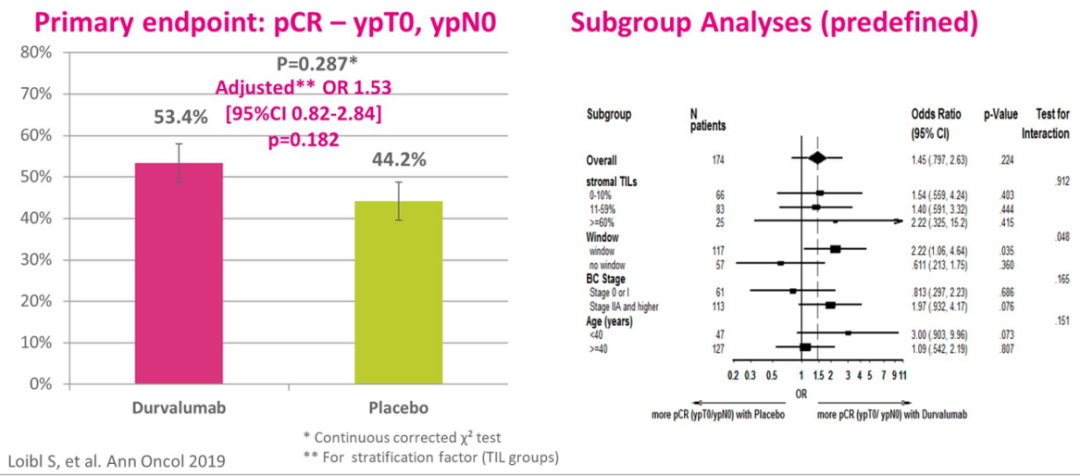 方法:GeparNuevo研究将经中心确认的cT1b—cT4a-d期的TNBC患者随机分为Durvalumab(D)1.5g静脉注射组或安慰剂组,每4周治疗一次。前2周(窗口期)给予D/安慰剂单药治疗(静脉注射0.75 g),随后每周给予D/安慰剂加纳米紫杉醇125 mg/m²治疗12周,序贯D/安慰剂联合表阿霉素/环磷酰胺化疗(EC)每2周一次,共4个周期。随机分组依据间质肿瘤浸润淋巴细胞(STIL)分层:低(≤10%),中等(11~59%),高(≥60%)。主要终点是pCR(ypT0-ypN0)。次要终点包括侵袭性无病生存率(iDFS)、远处无病生存率(DDFS)和总生存率(OS)。