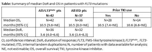 86%(36/42) FLT3mut+AML患者获得mCRc,中位首次反应时间为1.0个月(范围:0.7-4.6),曾有FLT3酪氨酸激酶抑制剂(TKI)暴露史的患者中mCRc率为86%(24/28)。在基线和至少一个随访时间点进行PCR检测的mCRc患者中,69%(18/26)观察到FLT3分子学清除(<10-2)。DoR和OS总结见下表。