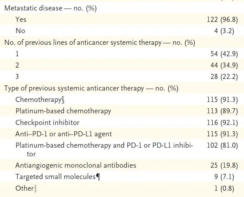 从2019年8月至2020年2月,共计126例患者纳入研究,其中2例患者基线无可测量数据,1例患者没有中心实验室确认的G12C突变。数据截止时间为2020年3月,中位随访时间为15.3个月,患者既往中位治疗线数为两线,分别有89.7%和92.1%的患者既往接受过铂类药物治疗及免疫检查点抑制剂治疗,81%的患者接受过两者治疗 19.8%的患者接受过抗血管生成治疗(图1)。