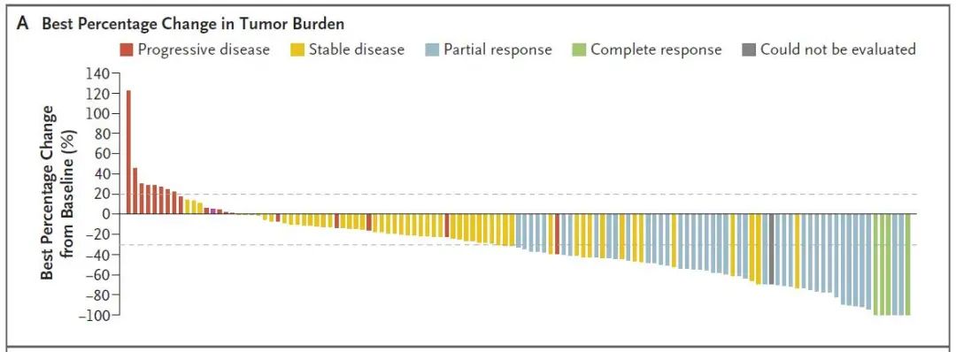 疗效:124例患者的 ORR为37.1%,其中CR比例为3.2%,PR比例为33.9%,DCR为80.6%,中位至响应出现时间为1.4个月,响应持续时间为11.1个月,3个月、6个月、9个月的响应持续率分别为90.5%、70.8%和57.3%(图2)。