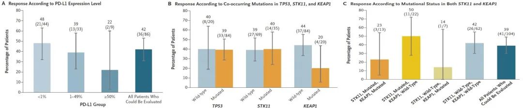 探索性研究分析了PD-L1表达水平、TMB水平、STK11、KEAP1及TP53共突变对疗效的影响。86例患者有PD-L1表达数据,其中,PD-L1表达小于1%和全组人群的ORR分别为48%和42%。84例患者具有可评估的TMB数据,TMB低表达和全组人群的ORR分别为42%和40%,合并STK11突变,但KEAP1野生型的患者和全组患者的ORR分别为50%和39%。KEAP1突变的患者及全组患者ORR分别为23%和14%。