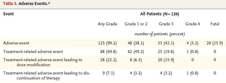 安全性:全组有99.2%的患者出现全因、任何级别不良反应,其中3度、4度、5度不良反应发生率分别为42.1%、3.2%和15.9%,69.8%的不良反应考虑和治疗相关,治疗相关的3度、4度不良反应发生率分别为19.8%和0.8%,没有治疗相关的5级不良事件出现,22.2%的患者因不良反应导致治疗中断,7.1%的患者永久性终止治疗(图6)。