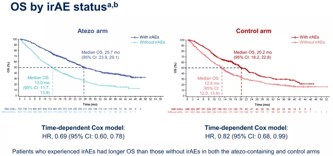 阿替利珠单抗组的中位OS:经历irAEs患者为25.7个月,无irAEs患者13.0个月,使用时间依赖的Cox模型,风险比(HR)为0.69;