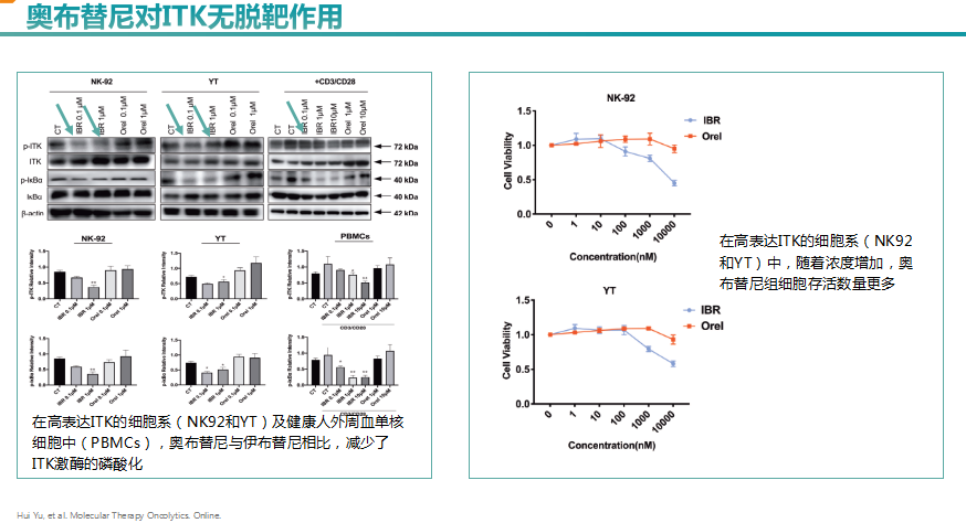 Hui Yu等在Molecular Therapy Oncolytics期刊上发表的一项研究【4】中,将奥布替尼与伊布替尼分别作用于在高表达ITK的细胞系(NK92和YT)及健康人外周血单核细胞中(PBMCs)。其结果显示:①较之于伊布替尼,奥布替尼组中的ITK激酶磷酸化要明显更少 ②在高表达ITK的细胞系(NK92和YT)中,随着浓度增加,奥布替尼组细胞存活数量更多(详见下图1)。换言之,奥布替尼没有因脱靶效应导致ITK抑制。