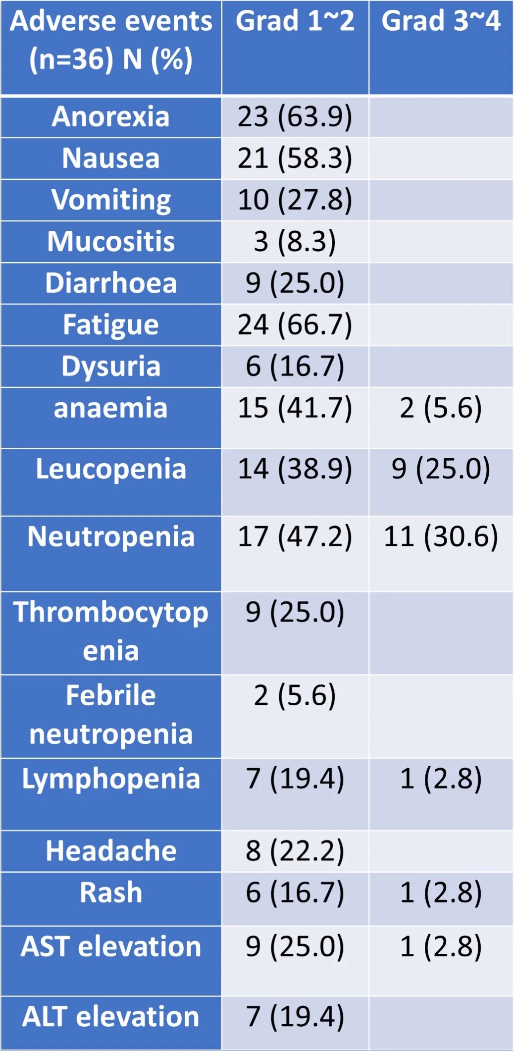 来自天津医科大学肿瘤医院的Gastrimm-001研究是一项由研究者发起的单臂Ⅱ期临床研究,旨在探索特瑞普利单抗联合FLOT方案围手术期治疗可切除的胃及胃食管结合部腺癌的主要病理缓解率及3年无病生存率。研究对36例可切除的进展期(>T2或N+)胃癌或胃食管结合部腺癌,术前给予4周期特瑞普利联合FLOT方案化疗,术后再给4周前特瑞普利联合FLOT方案化疗。入组患者的平均年龄60岁,其中T3/T4患者占91.7%,N+患者占88.9%(表1)。术前术后分别给予4周前特瑞普利联合FLOT方案(每一周期化疗前给予特瑞普利单抗240 mg,d1;多西他赛50mg/m2,d1;氟尿嘧啶2600 mg/m2,d1,持续泵入24小时;亚叶酸钙200 mg/m2,d1;奥沙利铂85 mg/m2,d1)。主要研究终点包括主要病理缓解率(MPR)及3年无病生存率(DFS),次要终点包括病理完全缓解率、安全性、有效率、3年及5年生存率。至2021年2月共有36例患者入组,其中2例患者治疗后拒绝手术治疗,6例患者尚未完成术前治疗。28例完成手术的患者术后病理显示有7例达到完全病理缓解(TRG1a),5例接近完全病理缓解(TRG1b),主要病理缓解率42.9%(表2)。常见不良事件包括厌食、恶心、乏力贫血等,其中3级以上的不良事件中性粒细胞减少(30.6%)、白细胞减少(25.0%)及贫血(5.6%)等(表3)。研究结果初步显示FLOT方案联合特瑞普利单抗围手术期治疗可切除的胃或胃食管结合部腺癌进一步提高了病理缓解率及主要病理缓解率,为进一步提高无病生存奠定了基础。联合方案并没有明显增加不良反应及手术并发症。