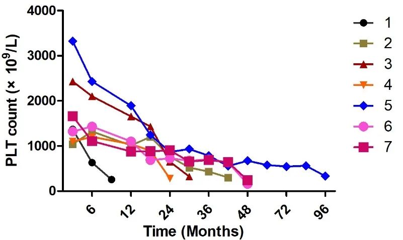 图2. 自发性血小板缓解的7例儿童的血小板趋势图。