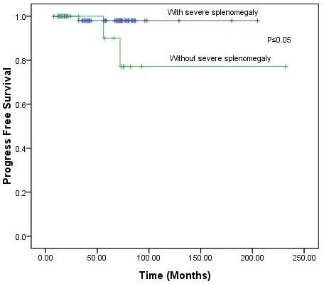 图3. 伴或不伴重度脾大患者的无进展生存比较
